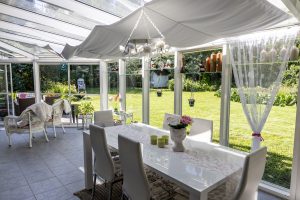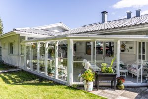 Olohuoneesta avautuu käynti upealle, 36 m² lasitetulle terassille, joka toimii lähes ympäri vuoden viihtyisänä lisätilana esimerkiksi ruokailuun, oleskeluun tai lasten leikeille, kulku takapihalle. Khh:n sisäänkäynnin edessä on toinen pienempi terassi.