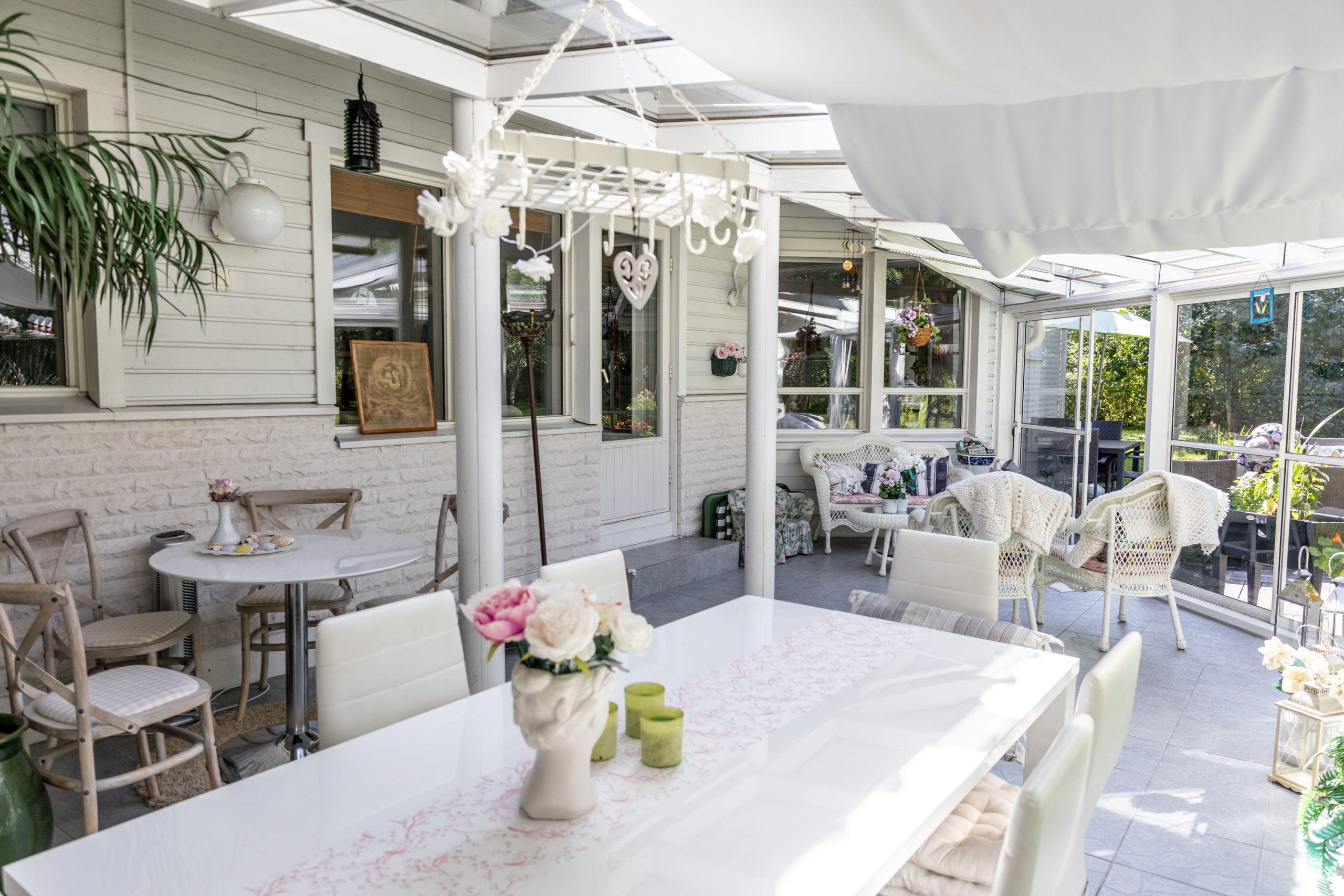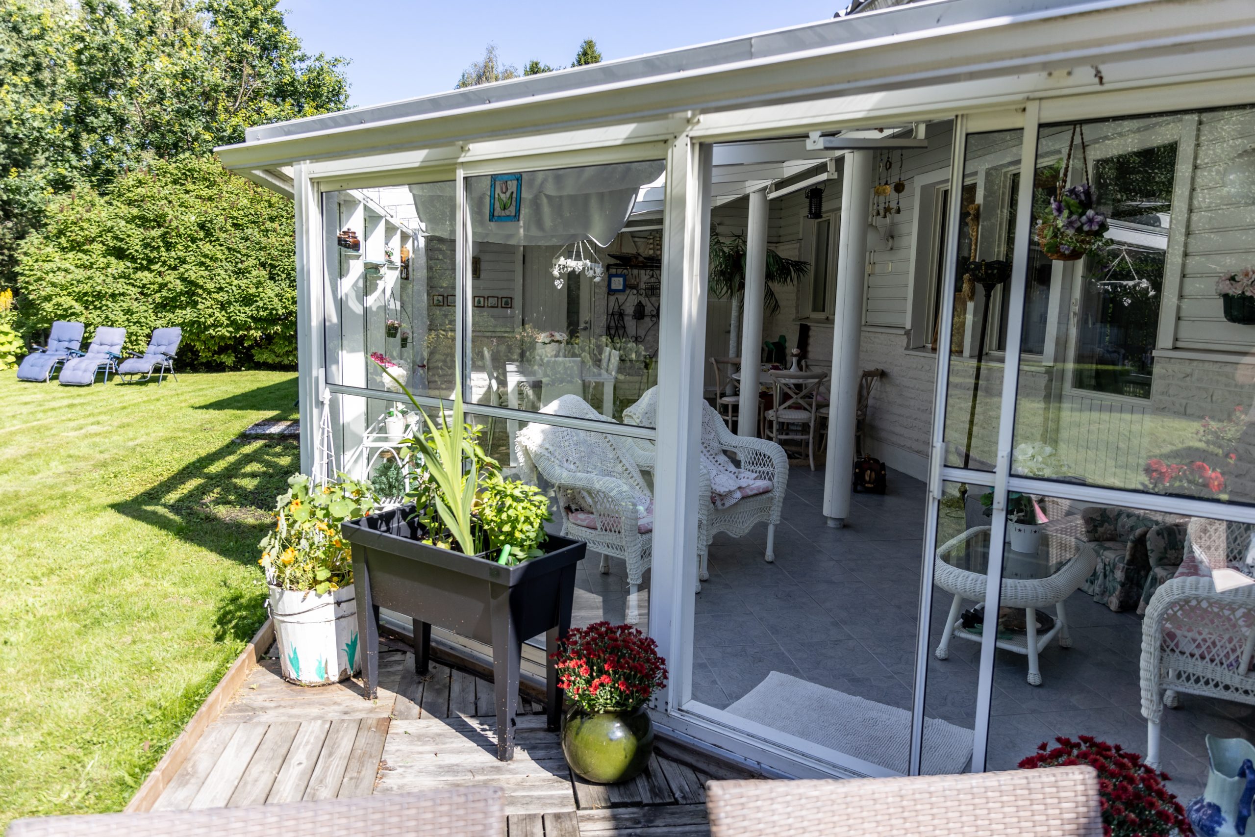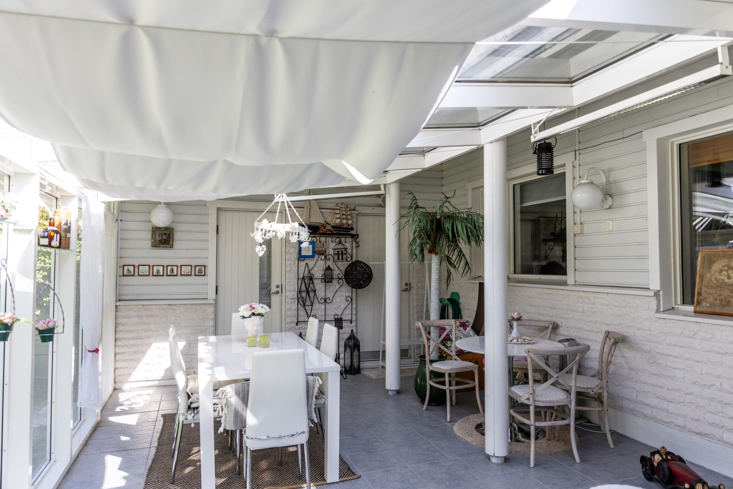 Olohuoneesta avautuu käynti upealle, 36 m² lasitetulle terassille, joka toimii lähes ympäri vuoden viihtyisänä lisätilana esimerkiksi ruokailuun, oleskeluun tai lasten leikeille, kulku takapihalle. Khh:n sisäänkäynnin edessä on toinen pienempi terassi.