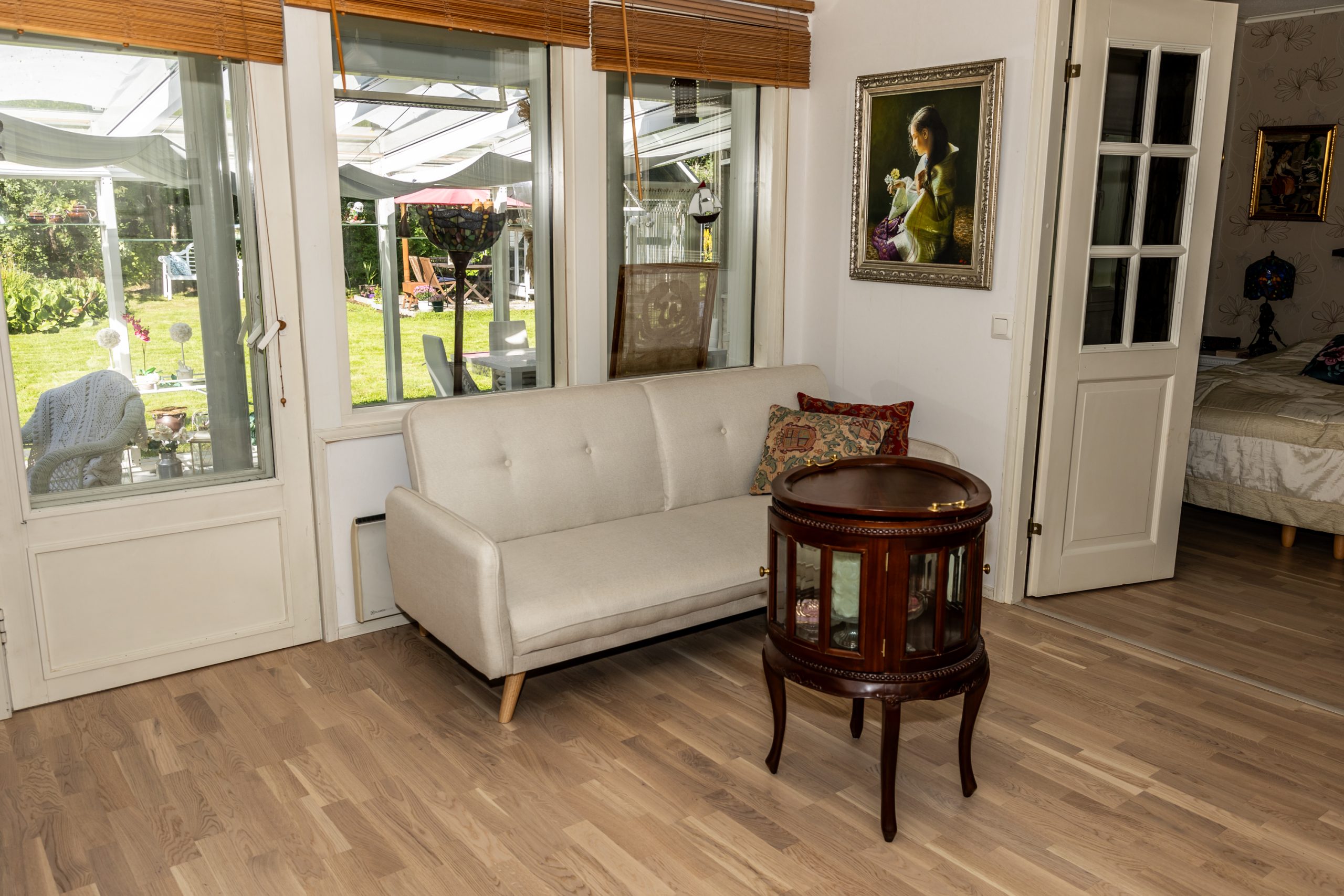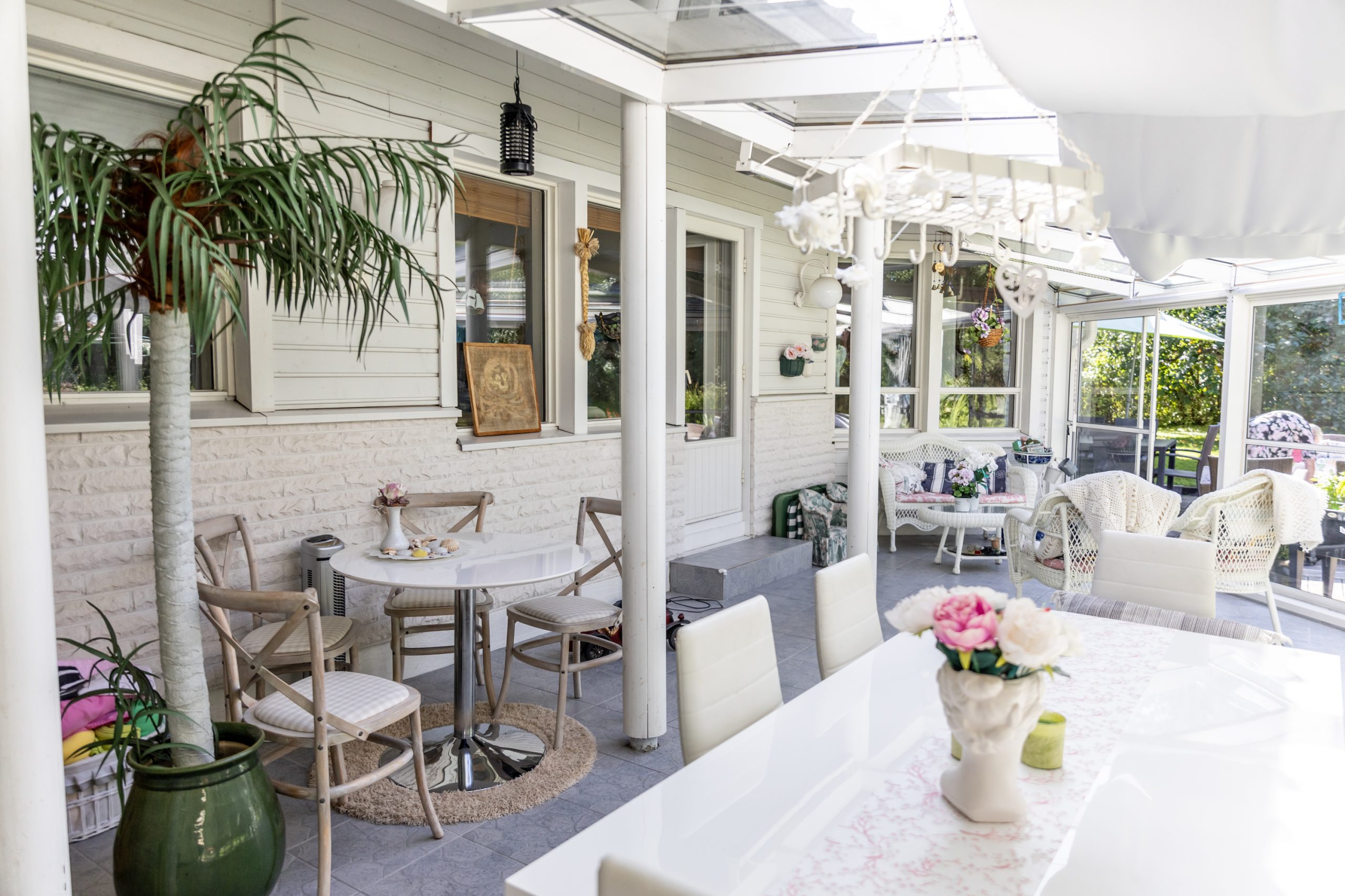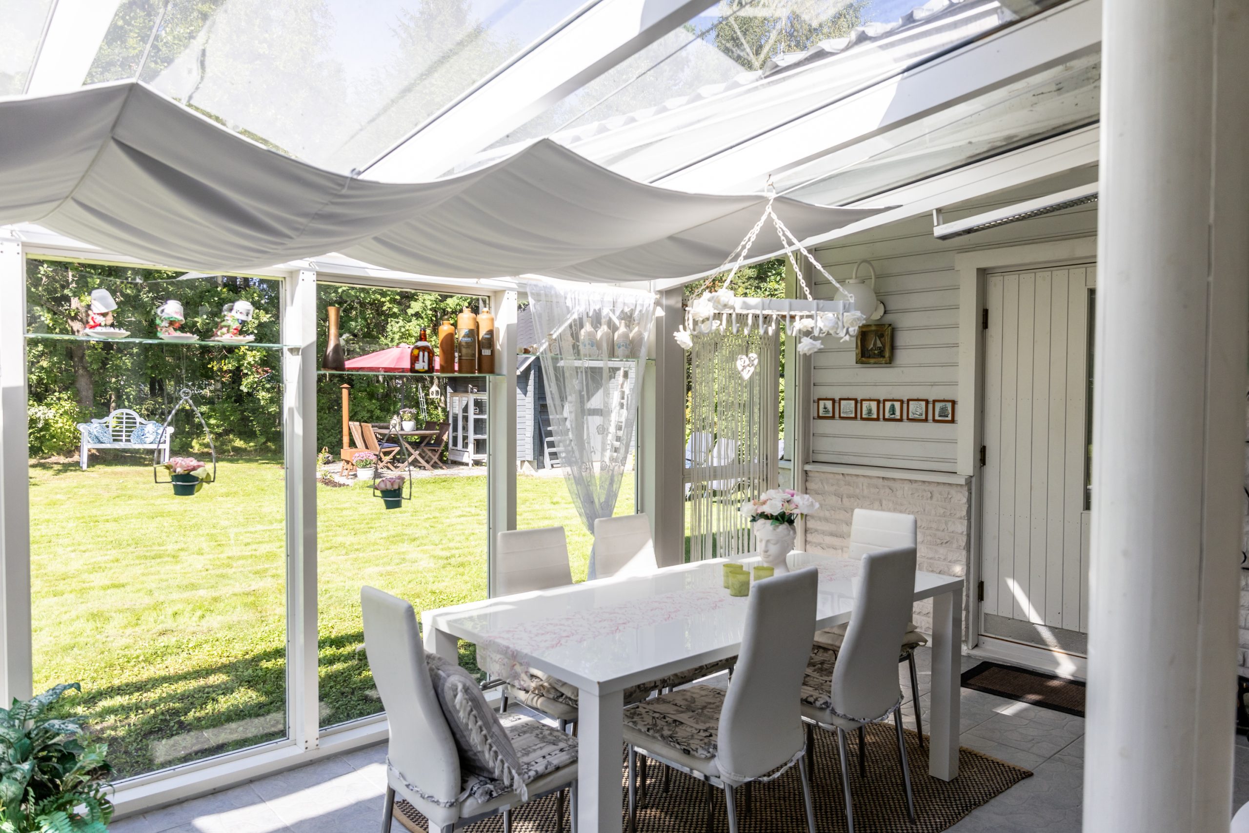 Olohuoneesta avautuu käynti upealle, 36 m² lasitetulle terassille, joka toimii lähes ympäri vuoden viihtyisänä lisätilana esimerkiksi ruokailuun, oleskeluun tai lasten leikeille, kulku takapihalle. Khh:n sisäänkäynnin edessä on toinen pienempi terassi.