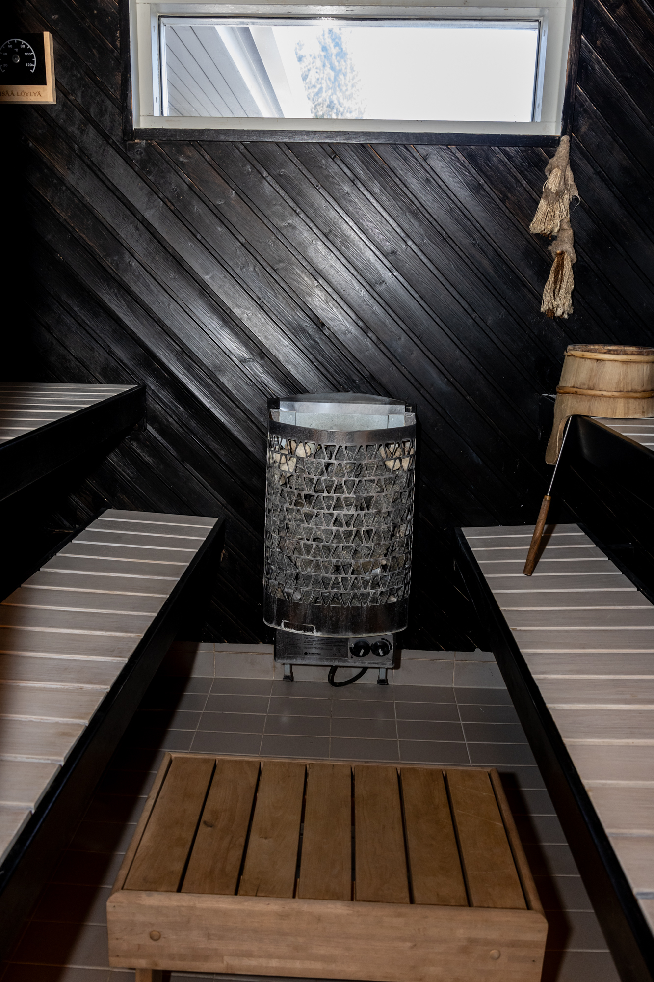 - Sauna:: vastakkain istuttavat lauteet, sähkökiuas