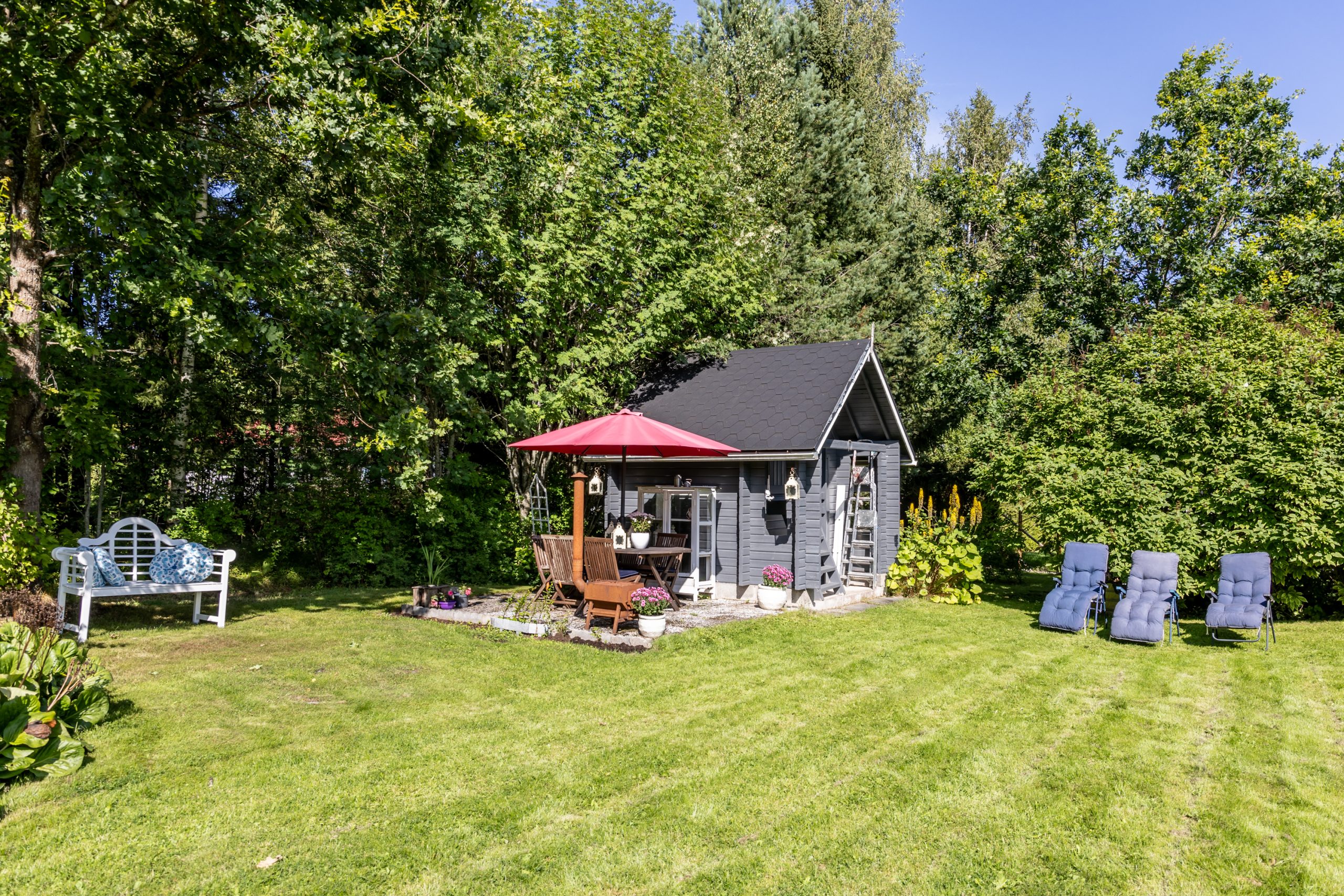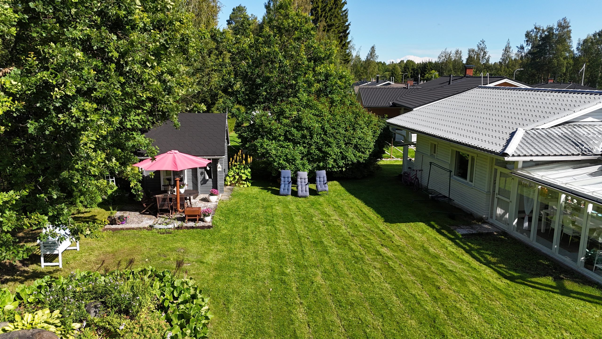 Reilunkokoinen 1268 m² tontti on pääosin nurmikkoa ja tarjoaa runsaasti tilaa lasten leikeille ja ulkoilulle. Takapihalta löytyy leikkimökki sekä hirsirakennus jossa on varasto, sekä leikki- että nukkumaparvi lapsille – todellinen lasten valtakunta! Piha rajoittuu rauhoittavaan metsään, mikä tuo omaa yksityisyyttä ja luonnon tuntua arkeen. Tilava autotalli jossa mm. lattialämmitys, vesipiste, hiekanerotuskaivo.