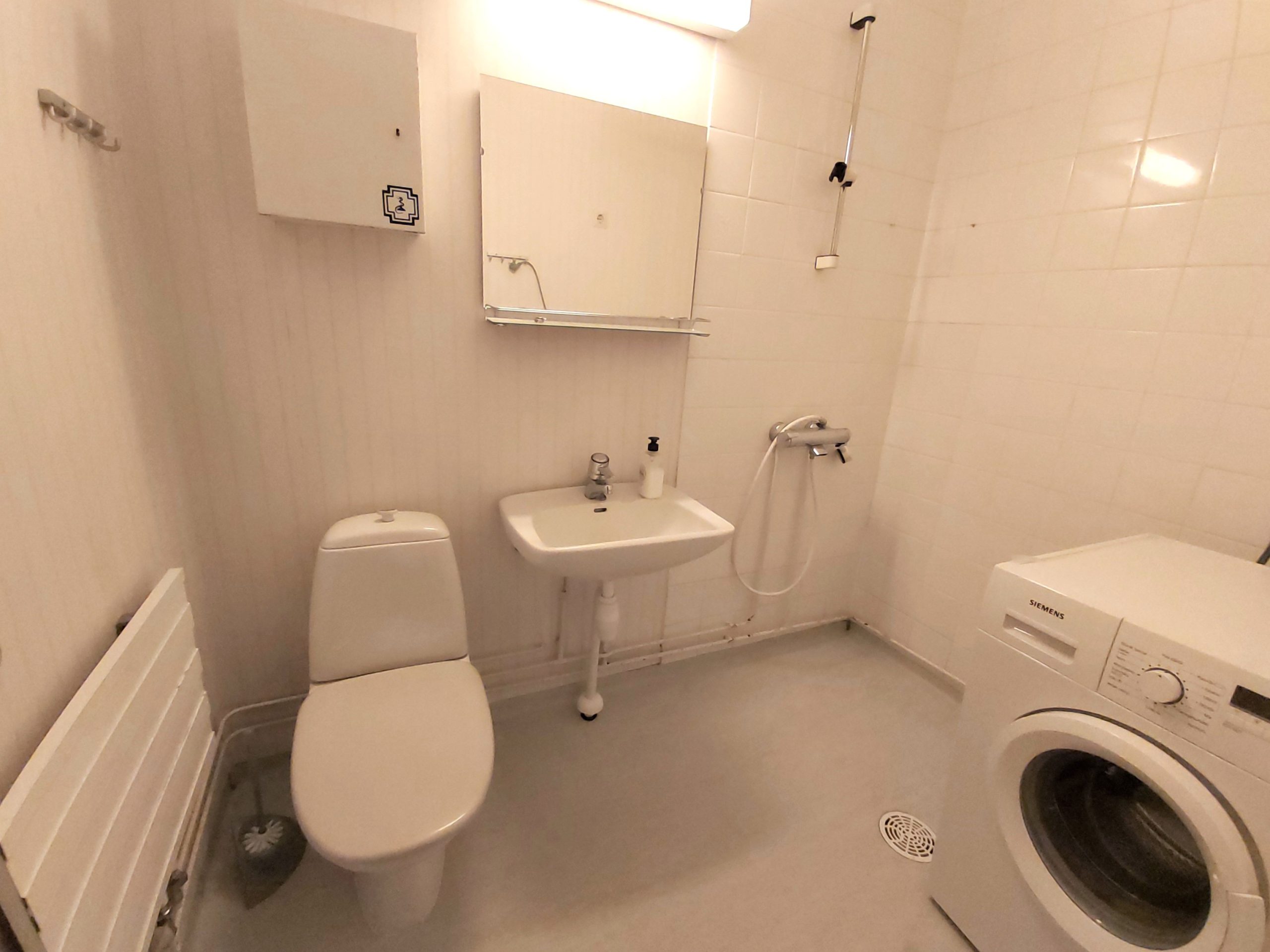 - Materiaalien ja varusteiden kuvaus:: muovilattia, osalaatoitus seinässä/tapetti, peili, wc-astuin, pesukoneliitäntä.